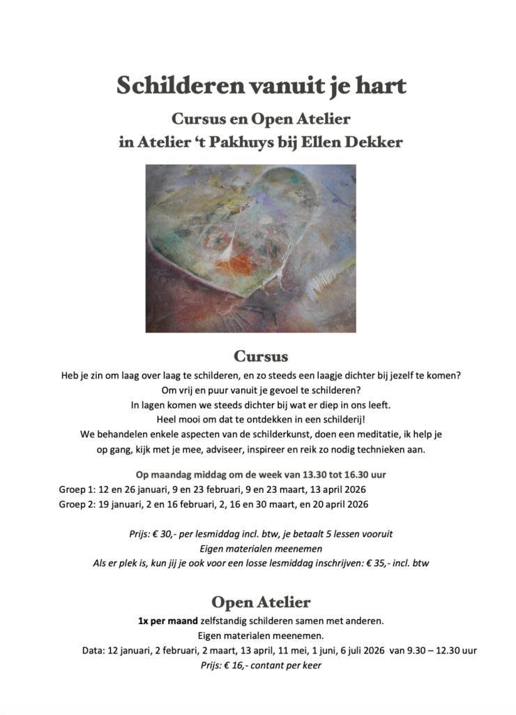 v.a. maandag 12 januari: Open Atelier en cursus Schilderen vanuit je Hart